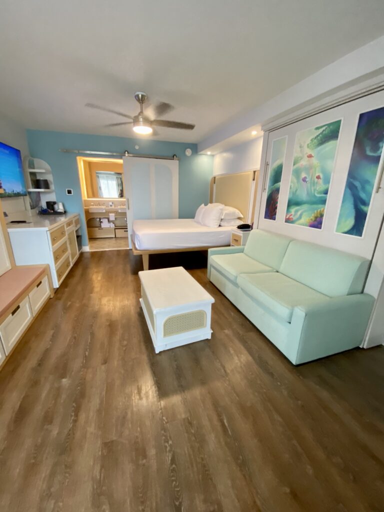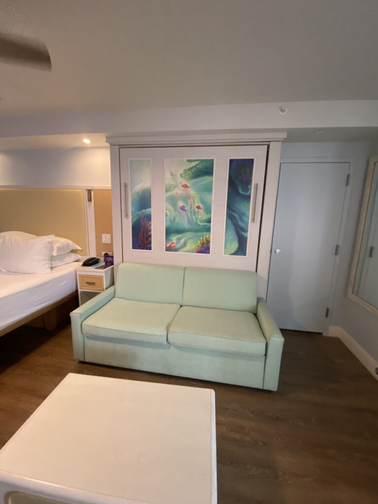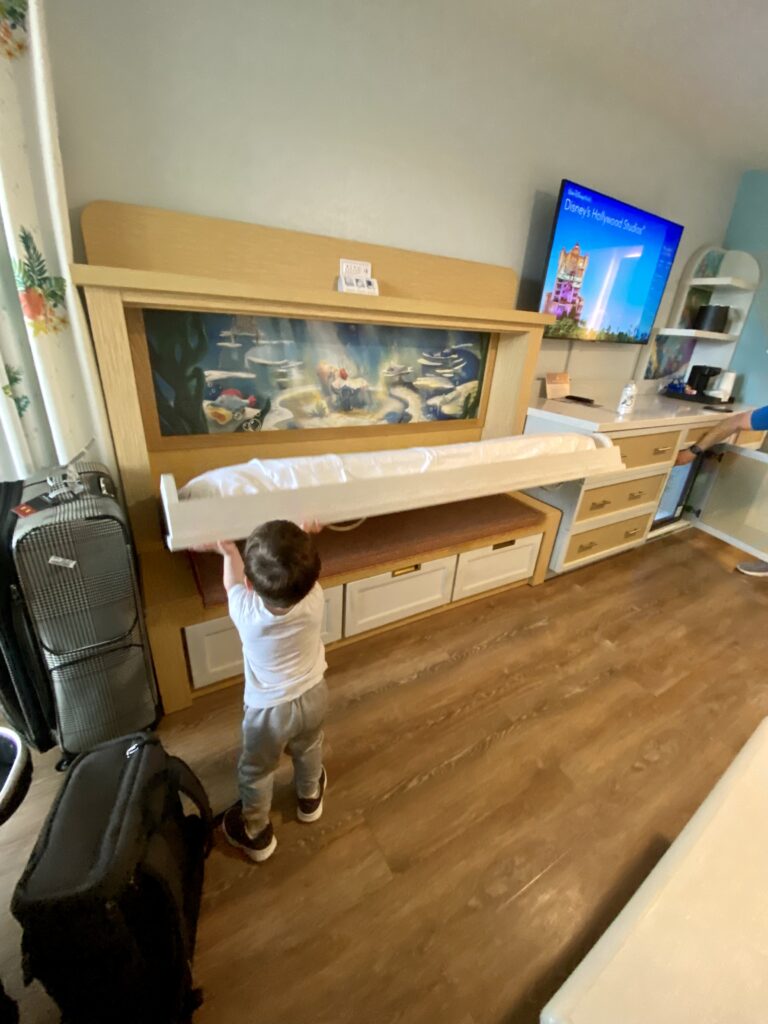 Both resorts offer early entry 30 minutes early to all parks. We find this is a great time to ride the popular rides before the crowds get there. Our kids wake up early so we’re up anyway. The other thing we liked about both resorts is they offer double rooms with a bed that folds out of the wall. Since our kids are both in cribs or pack n plays, we do not need a second bed. We enjoy the extra space the rooms provide with the second bed folded into the wall. Our room at Caribbean beach was a 5th sleeper room and our room at pop century wasn’t so if you are traveling as a family of 5, that could be a deciding factor.